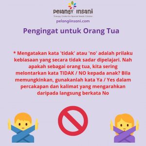 * Mengatakan kata ‘tidak’ atau ‘no’ adalah prilaku kebiasaan yang secara tidak sadar dipelajari. Nah apakah sebagai orang tua, kita sering melontarkan kata TIDAK / NO kepada anak? Bila memungkinkan, gunakanlah kata Ya / Yes dalam percakapan dan kalimat yang mengarahkan daripada langsung berkata No
