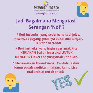 * Beri instruksi yang ingin agar anak kita KERJAKAN bukan instruksi UNTUK MENGHENTIKAN apa yang anak kerjakan.
