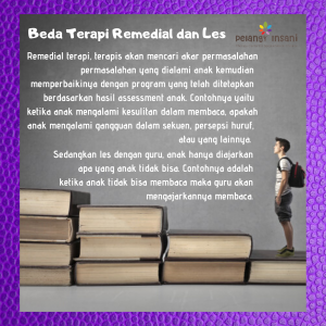 Perbedaan antara remedial terapi dengan les oleh guru adalah pada remedial terapi, terapis akan mencari akar permasalahan permasalahan yang dialami anak kemudian memperbaikinya dengan program yang telah ditetapkan berdasarkan hasil assessment anak. Contohnya yaitu ketika anak mengalami kesulitan dalam membaca, apakah anak mengalami gangguan dalam sekuen, persepsi huruf, atau yang lainnya. Sedangkan les dengan guru, anak hanya diajarkan apa yang anak tidak bisa. Contohnya adalah ketika anak tidak bisa membaca maka guru akan mengajarkannya membaca.