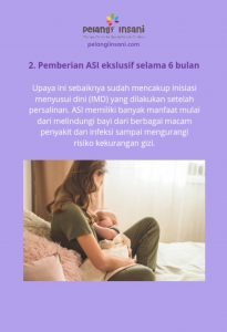 Upaya ini sebaiknya sudah mencangkup inisiasi menyusui dini (IMD) yang dilakukan setelah persalinan. ASI memiliki banyak manfaat mulai dari melindungi bayi dari berbagai macam penyakit dan infeksi sampai mengurangi risiko kekurangan gizi.