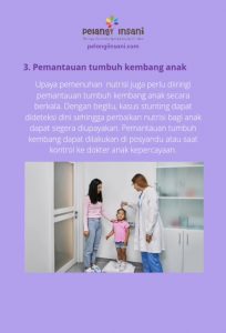 Upaya pemenuhan nutrisi juga perlu diiringi pemantauan tumbuh kembang anak secara berkala. Dengan begitu, kasus stunting dapat diidentifikasi dini sehingga perbaikan nutrisi bagi anak dapat segera diupayakan. Pemantauan tumbuh kembang dapat dilakukan di posyandu atau saat kontrol ke dokter anak kepercayaan.