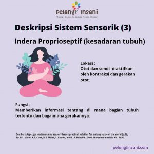 June 11,2023 By Admin 2 anak / kids / parenting / special needs 0 Comments anak, anakdidik, belajar, dirumahaja, emosianak, indra sensorik, kids, pelangiinsani, perkembangan anak Deskripsi sistem sensorik indra proprioseptif atau kesadaran tubuh Lokasi : Otot dan sendi diaktifkan oleh kontraksi dan gerakan otot. Fungsi : Memeberi informasi tentang dimana bagian tubuh tertentu dan bagaimana gerakannya.