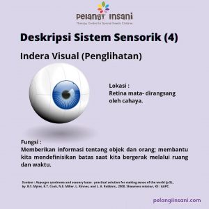 June 11,2023 By Admin 2 anak / kids / parenting / special needs 0 Comments anak, anakdidik, belajar, dirumahaja, emosianak, kids, otak, pelangiinsani Deskripsi sistem sensorik indra visual (penglihatan) Lokasi : Retina mata dirangsang oleh cahaya. Fungsi : Memberikan informasi tentang objek dan orang; membantu kita mendefinisikan batas saat kita bergerak melalui ruang dan waktu.