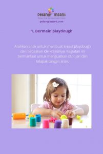 Arahkan anak untuk membuat kreasi playdough dan bebaskan ide kreasinya. Kegiatan ini bermanfaat untuk menguatkan otot jari dan telapak tangan anak.