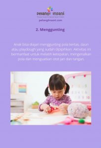 Anak bisa diajari menggunting pola kertas, daun atau playdough yang sudah dipipihkan. Aktivitas ini bermanfaat untuk melatih ketepatan, mengenalkan pola dan menguatkan otot jari dan tangan.