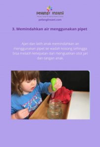 Ajari dan latih anak memindahkan air mengguanakan popet ke wadah kosong sehingga bisa melatih ketepatan dan menguatkan otot jari dan tangan anak.