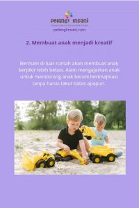 Bermain diluar rumah akan membuat anak berfikir lebih bebas. Alam mengajarkan anak untuk mendorong anak berani berimajinasi tanpa harus takut batas apapun.