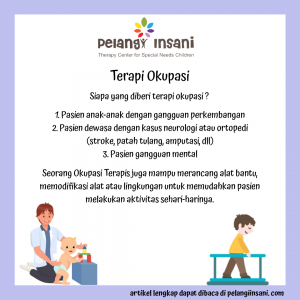 Lalu, kondisi apa saja yang bisa ditangani oleh Okupasi Terapis? Pasien yang bisa dirujuk ke Okupasi Terapis tidak terbatas pada tahap perkembangan tertentu melainkan semua umur bisa dirujuk untuk mendapatkan penanganan Okupasi Terapi. Sebagai contoh: pasien anak-anak. Banyak anak yang sejak kecil sudah mengalami kelainan atau gangguan perilaku/perkembangan. Sebagai contoh: autisme, spektrum autis, ADHD (Attention Deficit Hyperactive Disorder), ADD (Attention Deficit Disorder), DD (Delay Development/keterlambatan perkembangan), asperger syndrome, Down syndrome, mental retardasi (keterbelakangan mental), CP (Cerebral Palsy), dan sebagainya. Itu semua adalah sebagian besar dari kondisi anak yang bisa ditangani oleh Okupasi Terapis.